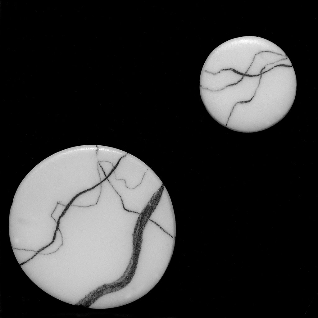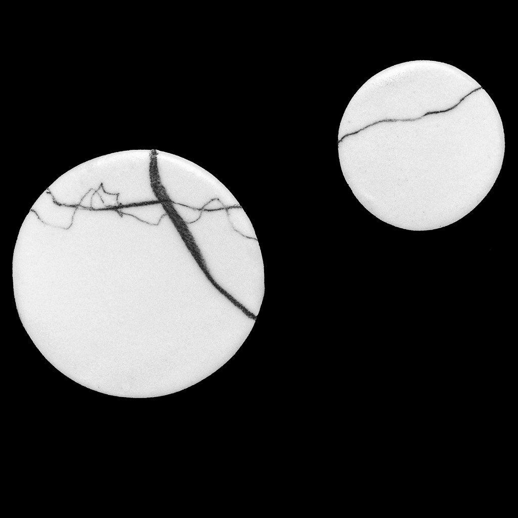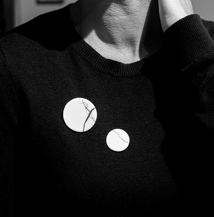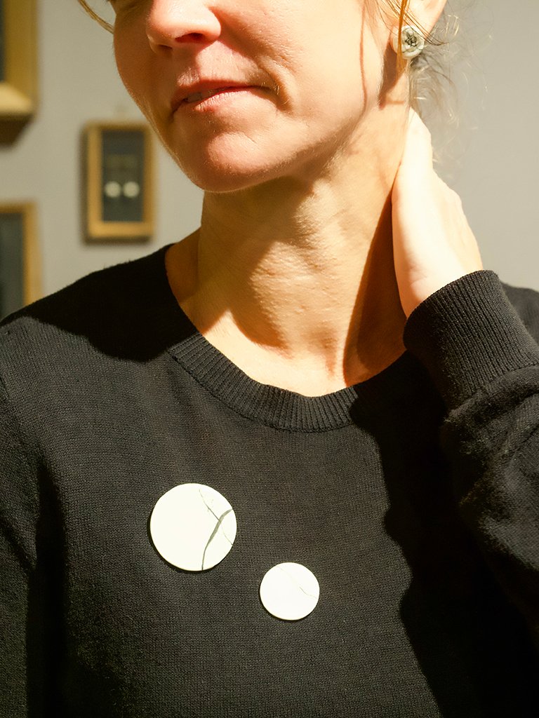 Fibule avec deux pièces de porcelaine avec un montage en laiton et fil d’inox.