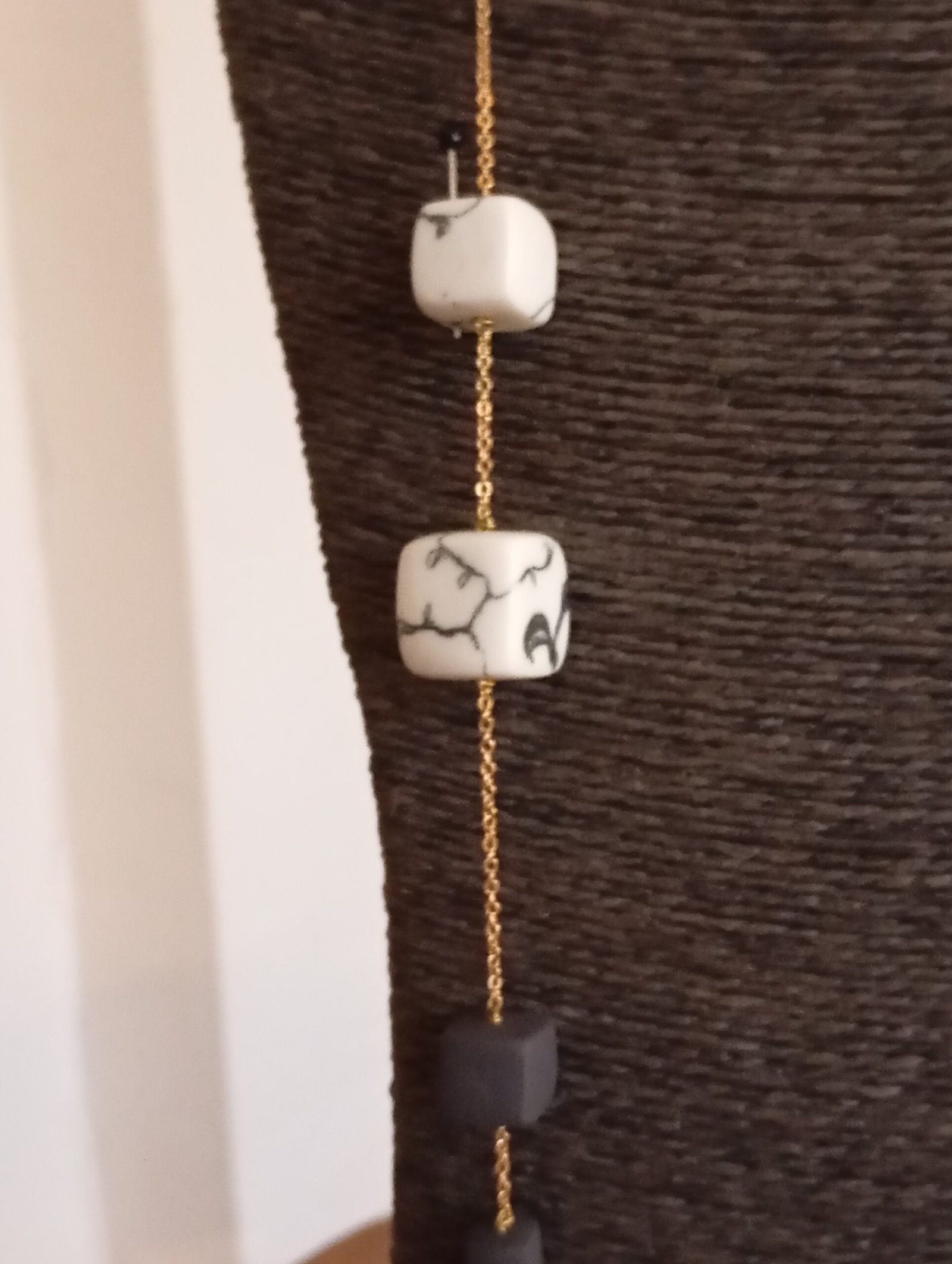 En collaboration avec Elise Dartmour pour les dessins sur perles de porcelaine, voici le sautoir « Botanicube » : graphique et élégant.